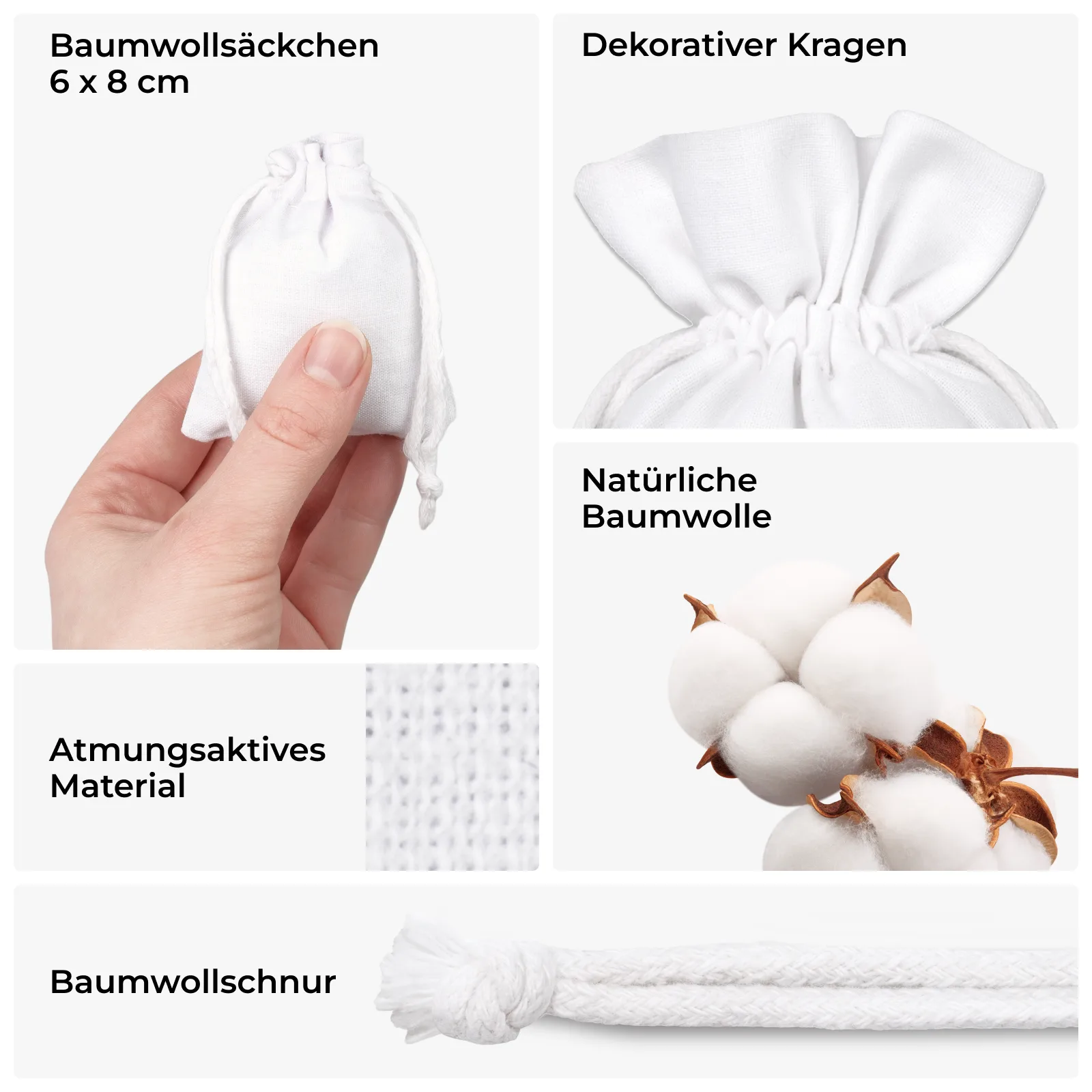 Unsere Baumwollbeutel sind ideal zum Verpacken von Schmuck, kleinen Kosmetikartikeln oder Kerzen. Sie eignen sich auch wunderbar als stilvolle Geschenkverpackung – sowohl privat als auch für Firmenpräsente.