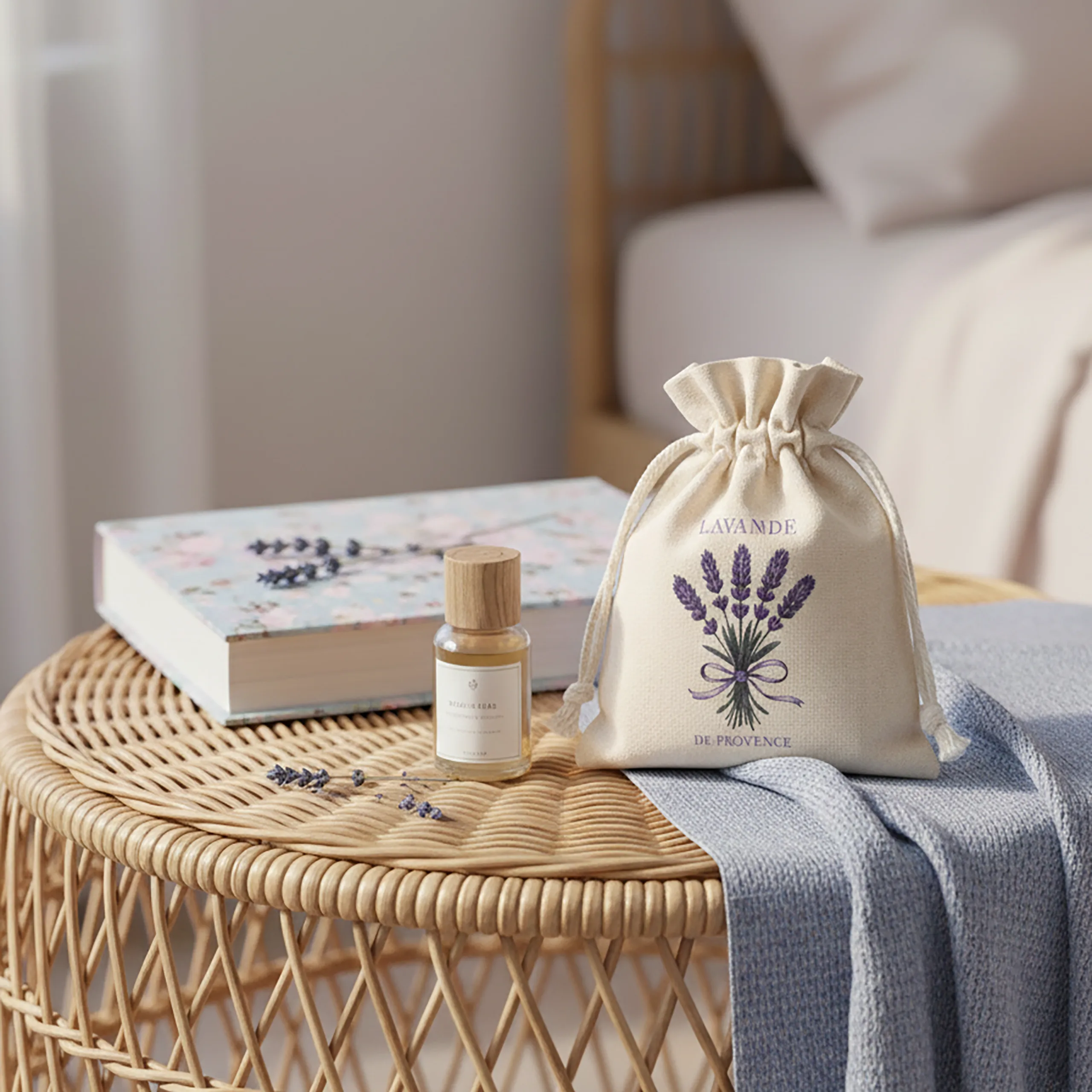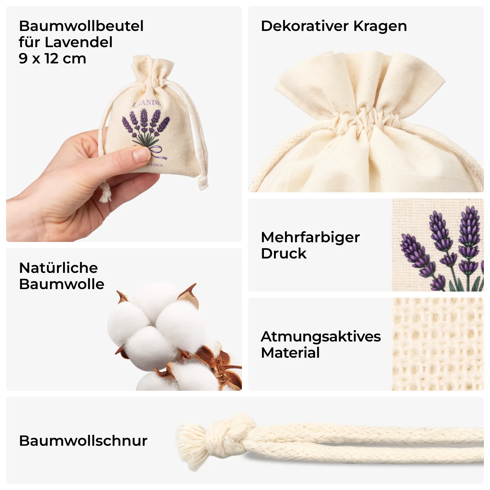 - sie bestehen aus naturfarbener Baumwolle, die optisch gut zu Lavendelprodukten und einem natürlichen Markenauftritt passt,