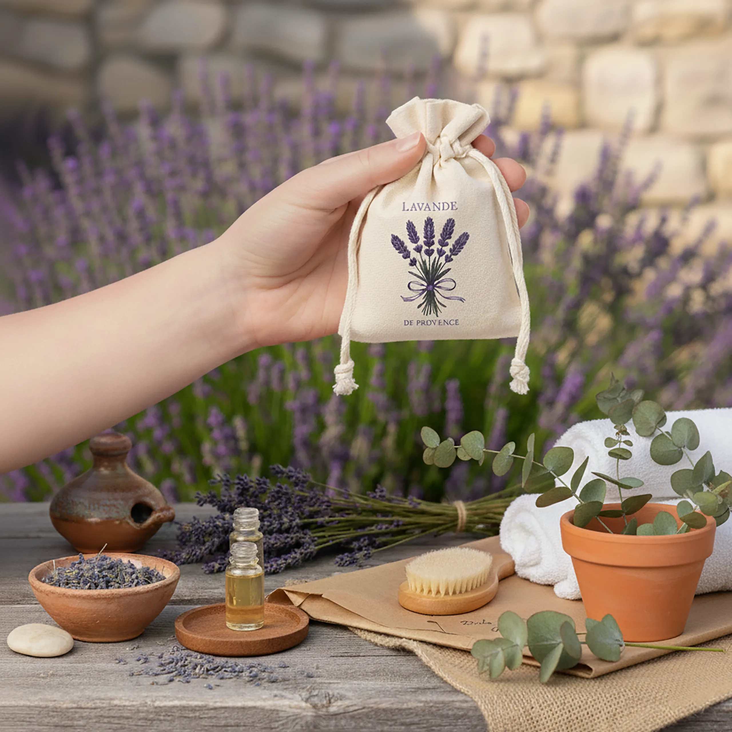 Saketos bietet Logodruck mit einer üblichen Produktionszeit von 5-10 Werktagen sowie einer Expressoption von 48 Stunden für ausgewählte Aufträge.Fügen Sie die Baumwollsäckchen Lavendel Provence 9 x 12 cm Ihrem Warenkorb hinzu und nutzen Sie sie als dekorative, wiederverwendbare Verpackung für Lavendelprodukte, kleine Geschenksets und Kundengeschenke.