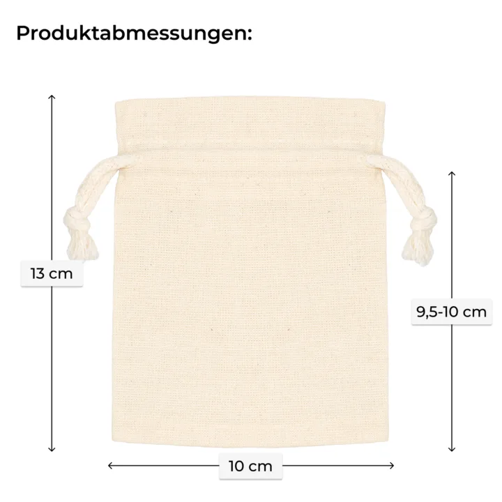 Eine Auswahl von 10 originellen Baumwollsäckchen in der Größe 10 x 13 cm, deren Naturfarbe für fast jede Situation perfekt geeignet ist. Das angebotene Set ist universell einsetzbar, da die Beutel je nach Situation auf vielfältige Weise verwendet werden können.