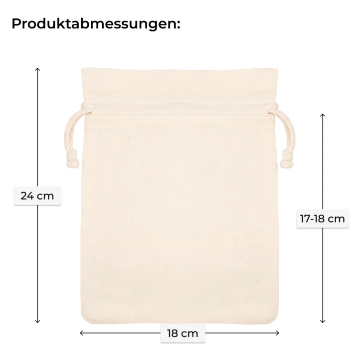 Ein haltbarer und praktischer Baumwollbeutel mit den Abmessungen 18 x 24 cm, lässt sich mit einer natürlichen Kordel zusammenziehen.