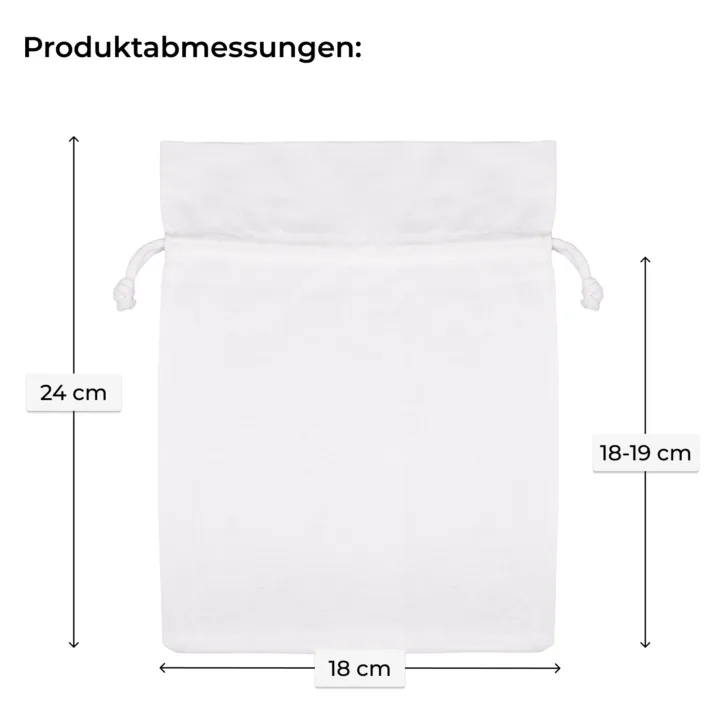 Wir bieten ein Set bestehend aus 5 Baumwollbeuteln, mit den Abmessungen 18 x 24 cm an. Dieses praktische Set ist in einer weiß Farbe erhältlich und wird lange halten.