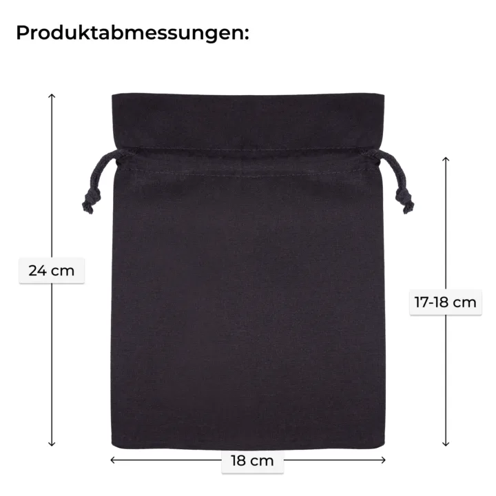 Wir bieten ein Set bestehend aus 5 Baumwollbeuteln, mit den Abmessungen 18 x 24 cm an. Dieses praktische Set ist in einer schwarz Farbe erhältlich und wird lange halten.