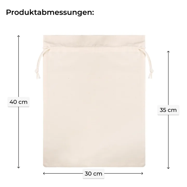 Der Baumwollbeutel 30x40 cm mit praktischem Kordelzug ist ein Klassiker unter den nachhaltigen Verpackungen. Hergestellt aus 100 % Baumwolle (145 g/m²) überzeugt er durch Langlebigkeit, natürliche Optik und vielseitige Einsatzmöglichkeiten. In der Packung befindet sich ein großer Beutel mit einem dekorativen Kragen über dem Tunnelzug. Er wird mit einer doppelten Baumwollkordel sicher verschlossen.