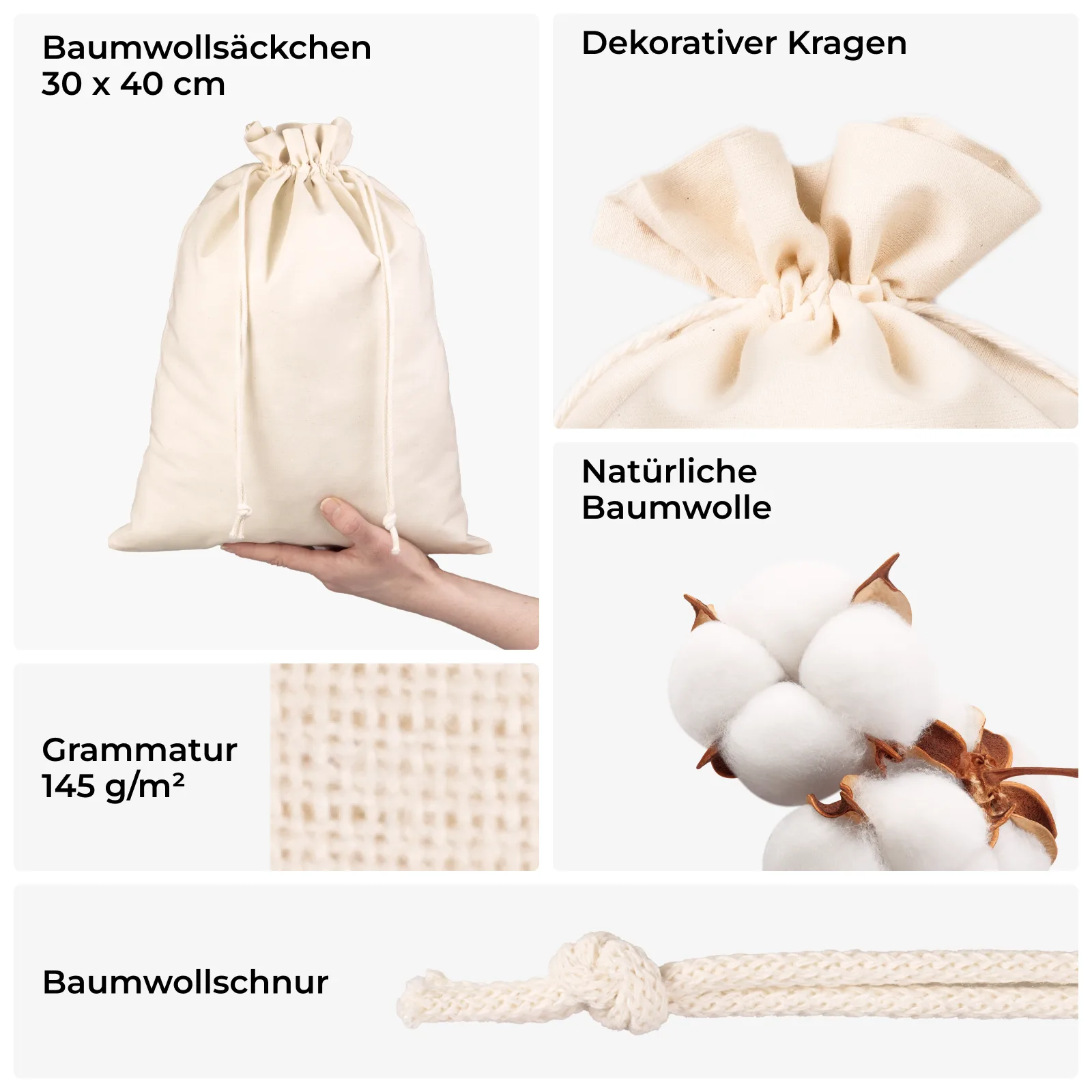 Der Baumwollbeutel 30x40 cm mit praktischem Kordelzug ist ein Klassiker unter den nachhaltigen Verpackungen. Hergestellt aus 100 % Baumwolle (145 g/m²) überzeugt er durch Langlebigkeit, natürliche Optik und vielseitige Einsatzmöglichkeiten. In der Packung befindet sich ein großer Beutel mit einem dekorativen Kragen über dem Tunnelzug. Er wird mit einer doppelten Baumwollkordel sicher verschlossen.