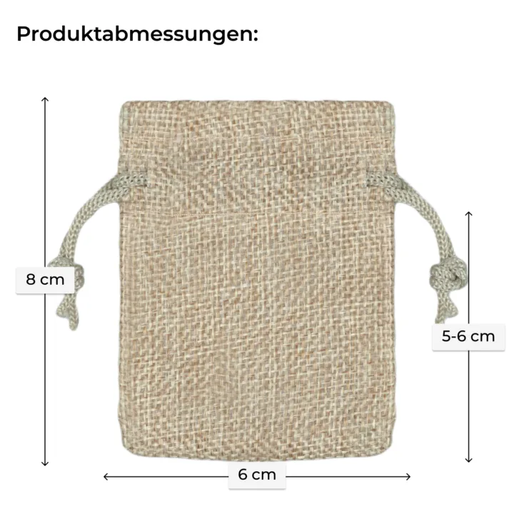 Kleine, vielseitig einsetzbare Jutebeutel in Farbe Naturfarbe und einer Größe von ca. 6 cm x 8 cm.