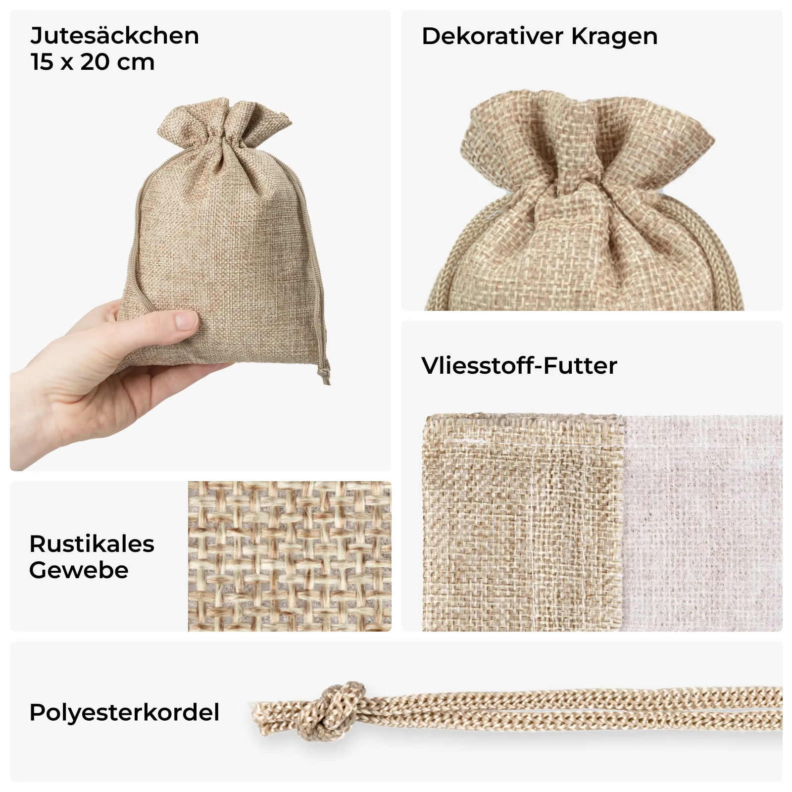 Jute ist ein strapazierfähiges Material, das sich ideal zur Herstellung von Beuteln mit Zugkordel eignet. Jutebeutel überzeugen nicht nur durch ihre Funktionalität, sondern auch durch ihr modisches Design und natürliche Farbe. Jutebeutel 15 x 20 cm werden aus synthetischem Jutestoff hergestellt, der robust und widerstandsfähig gegen Falten und mechanische Beschädigungen ist. Jede Packung enthält 5 Stück, und jeder Beutel kann mehrmals verwendet werden.
