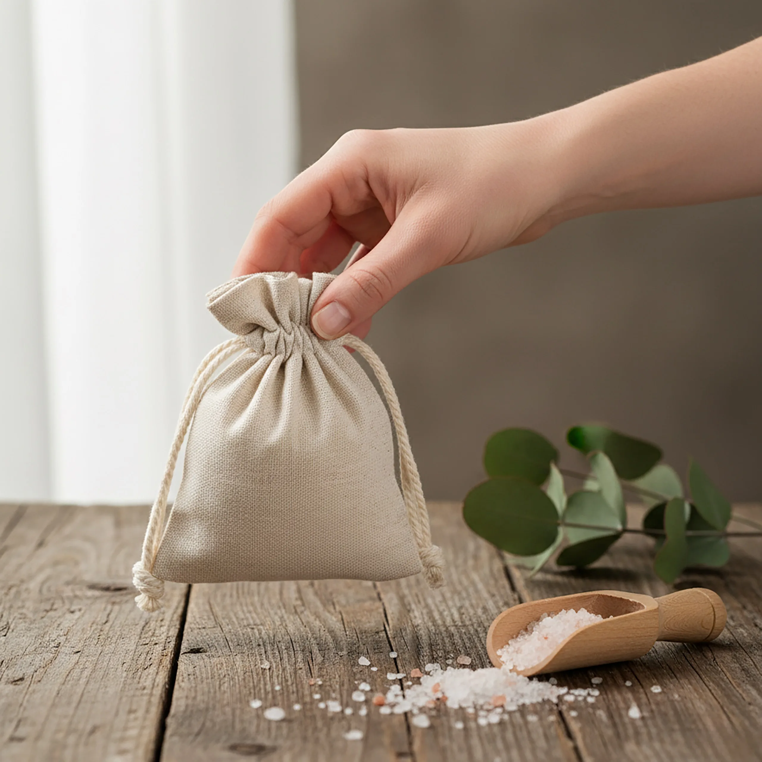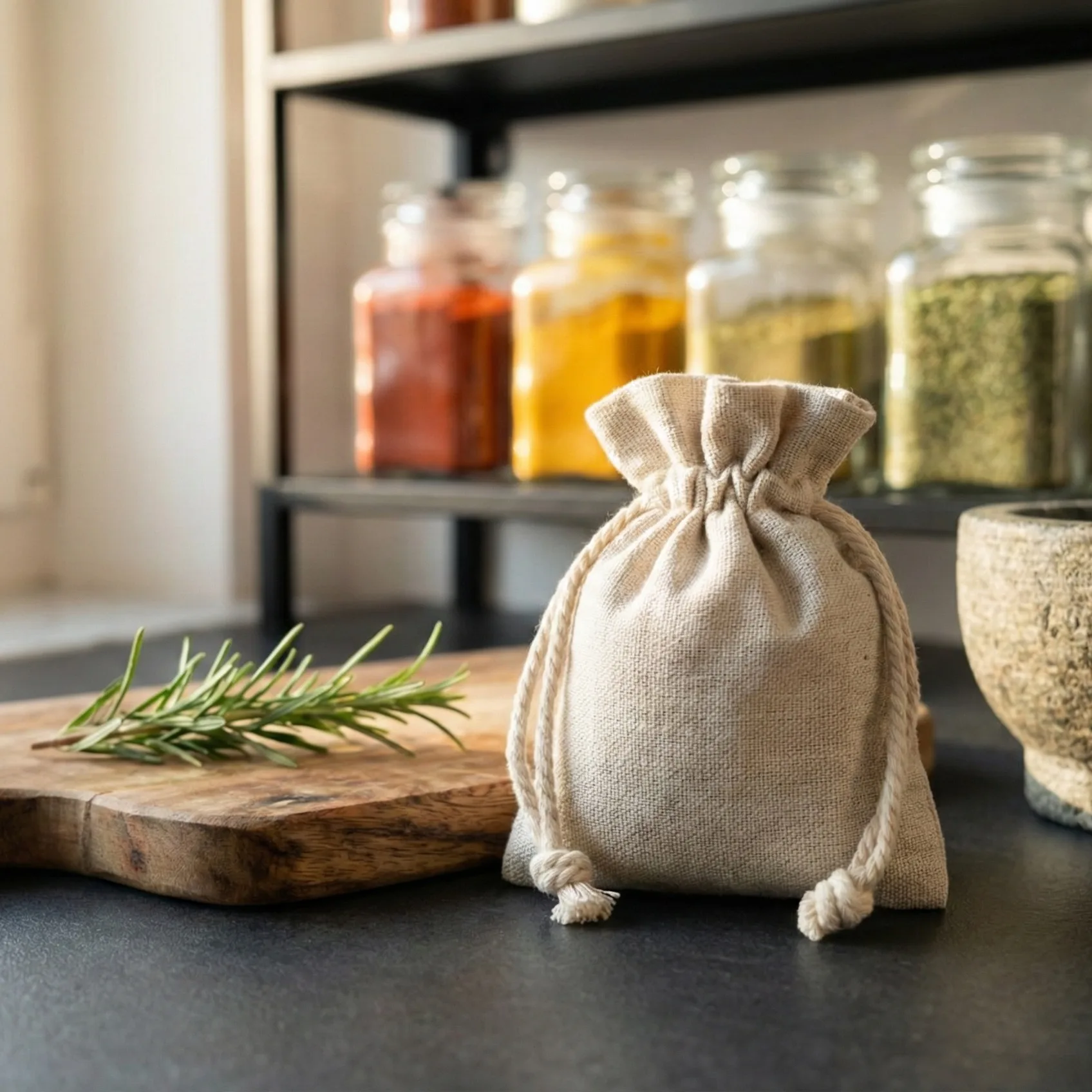 Diese kleinen Säckchen sind aus Baumwollgewebe mit synthetischen Fasern, die sich angenehm anfühlen und luftdurchlässig sind. Der Stoff sieht sehr stilvoll aus - er reproduziert die Textur und Farbe von natürlichen Leinen. Sein großer Vorteil ist seine außergewöhnlich hohe Haltbarkeit, Abrieb- und Knitterfestigkeit. Diese Mehrwegverpackungen sind die perfekte Wahl!