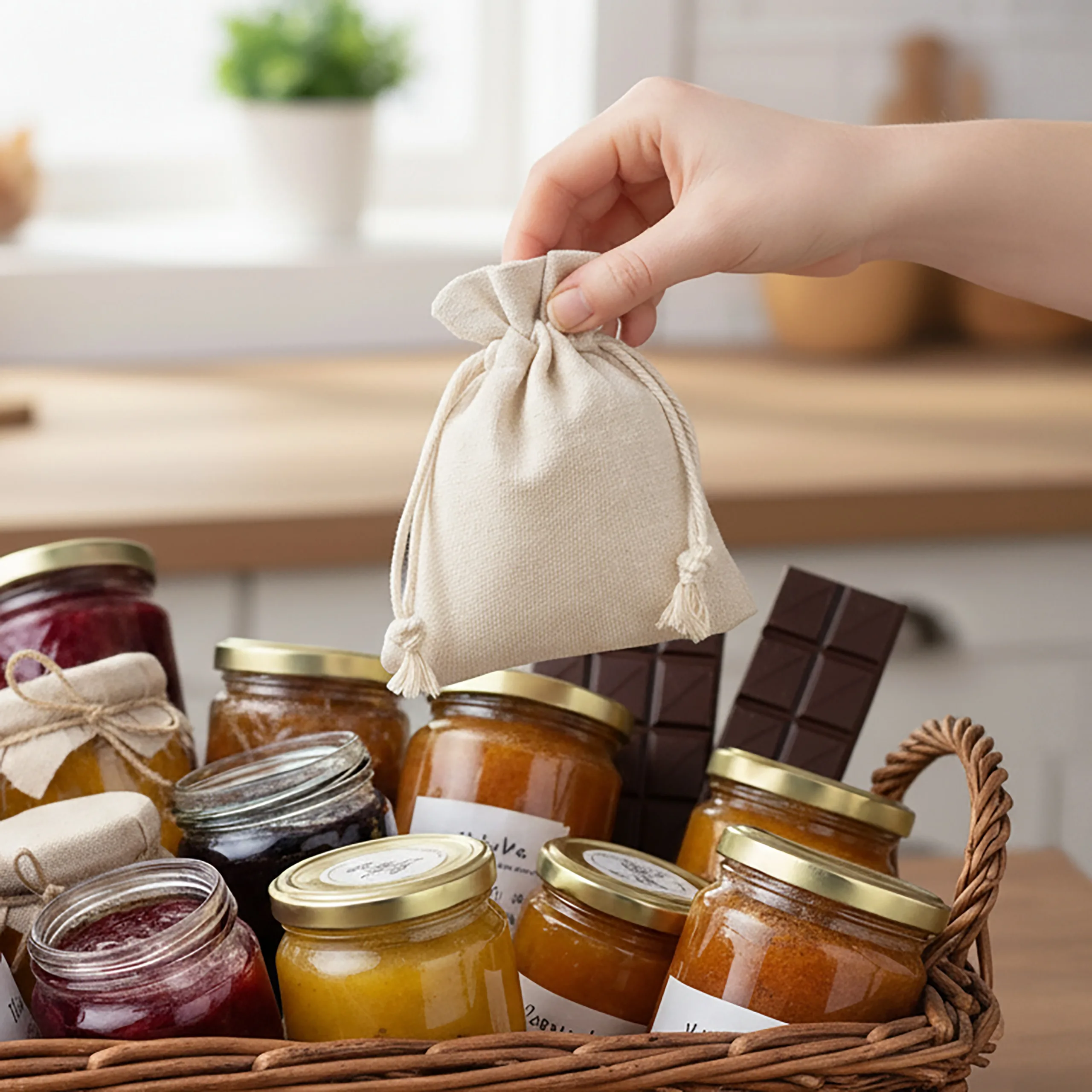Diese kleinen Säckchen sind aus Baumwollgewebe mit synthetischen Fasern, die sich angenehm anfühlen und luftdurchlässig sind. Der Stoff sieht sehr stilvoll aus - er reproduziert die Textur und Farbe von natürlichen Leinen. Sein großer Vorteil ist seine außergewöhnlich hohe Haltbarkeit, Abrieb- und Knitterfestigkeit. Diese Mehrwegverpackungen sind die perfekte Wahl!