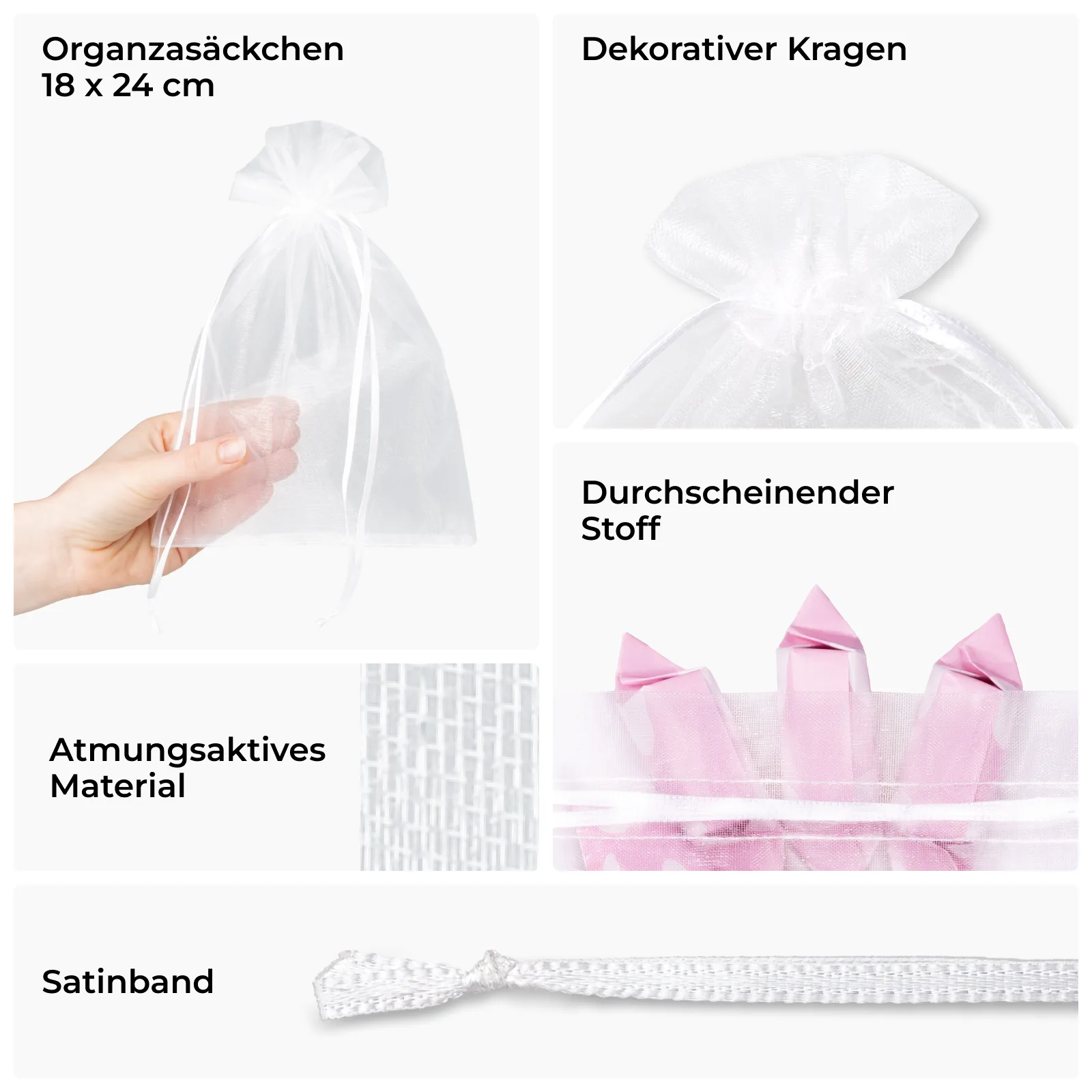 Ein Set, der 10 Stück Organzasäckchen in Farbe weiß enthält, lässt sich unterschiedlich anwenden. Die Größe von 18 cm x 24 cm ist bestens zum Aufbewahren von kleinen Gegenständen geeignet, wie etwa Schreibwaren, Werbegeschenke, kleine Figürchen und viele andere originelle Artikel - Vielseitigkeit von Organza passt praktisch zu jedem Artikel.