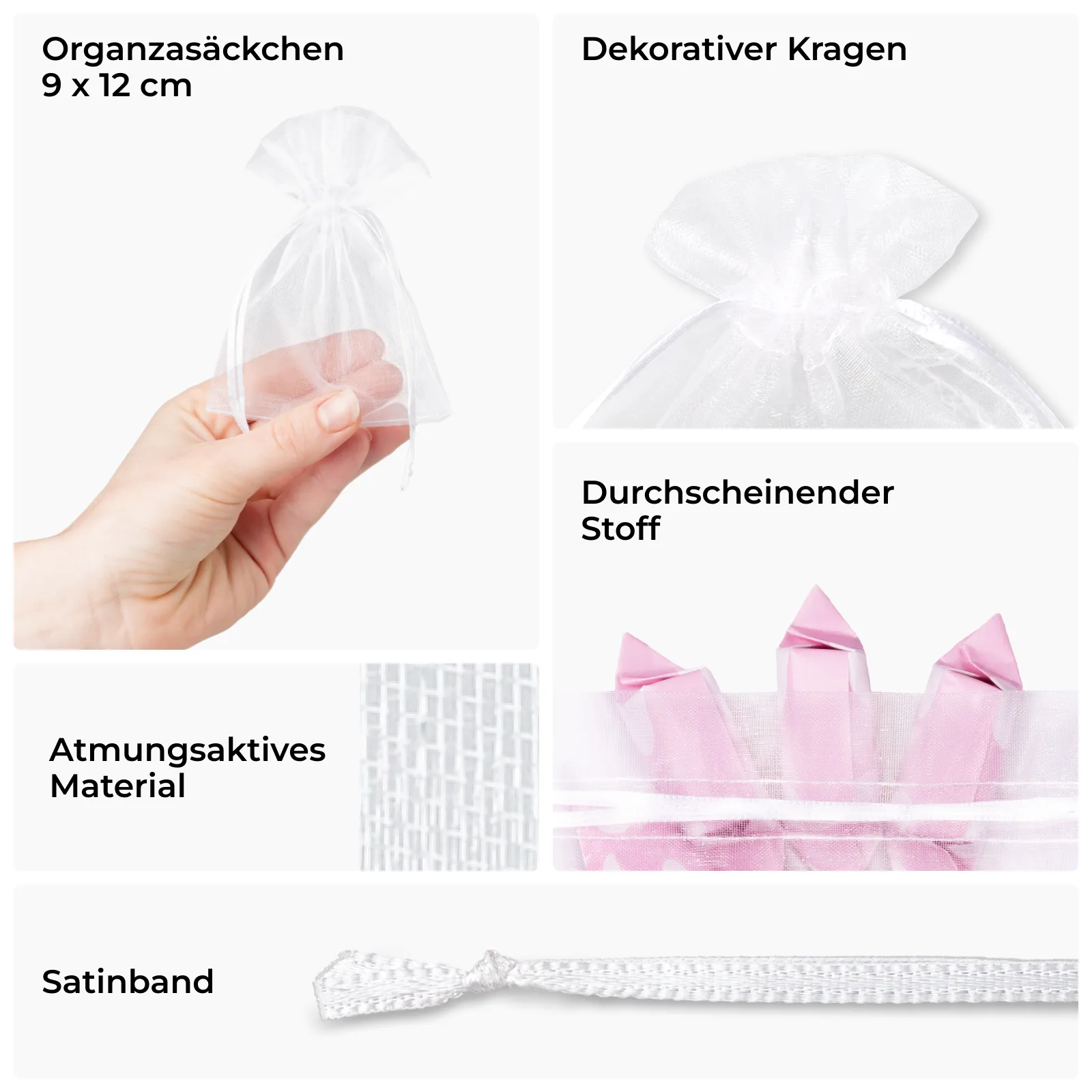 Ein Set, in dem kleine Organzasäckchen ca. 9 cm x 12 cm groß in Farbe weiß enthalten sind. Dieser praktische Set besteht aus 25 Stück, daher ist es nicht nötig, kurzfristig neue Beutel nachzubestellen.