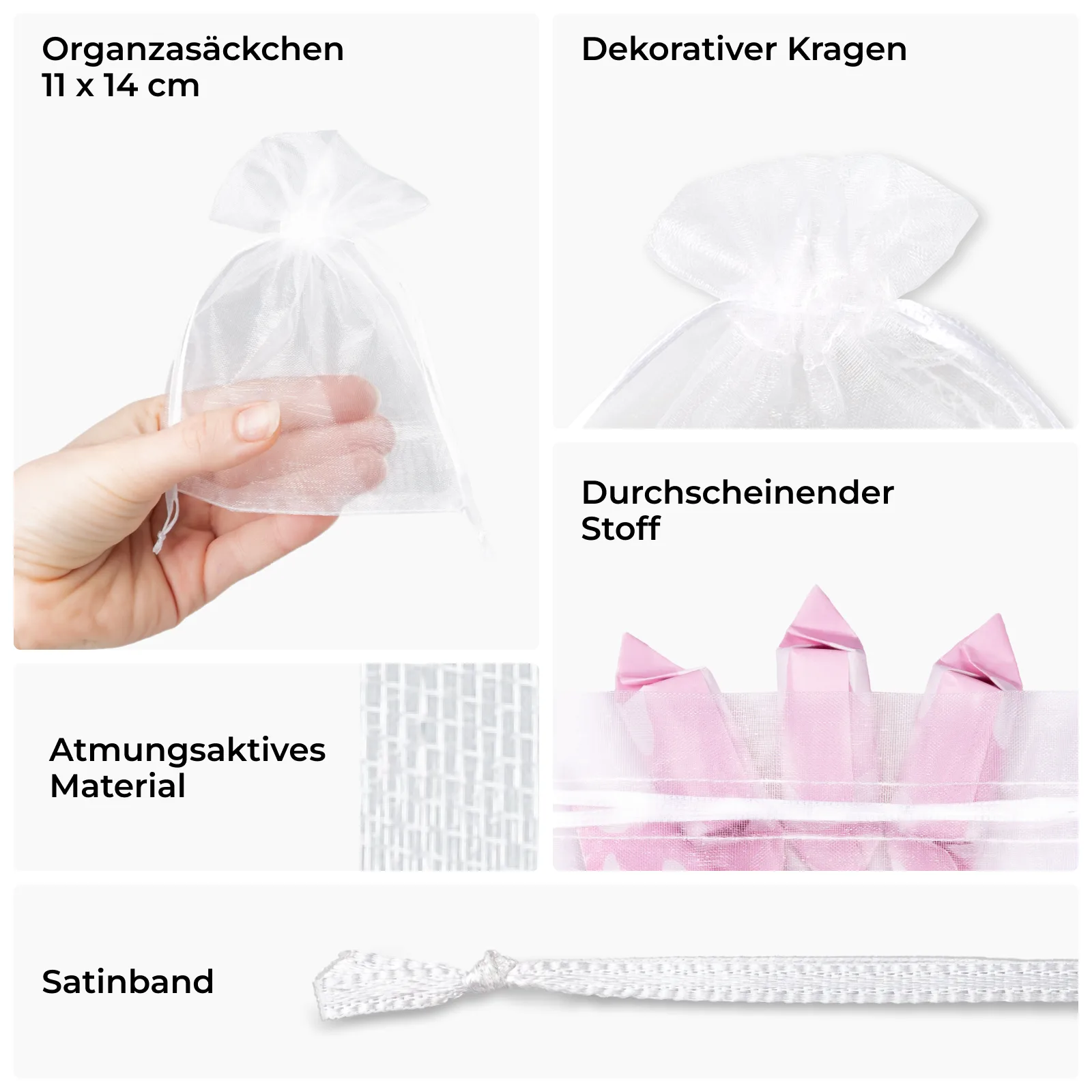 Ein Set, in dem kleine Organzasäckchen ca. 11 cm x 14 cm groß in Farbe weiß enthalten sind. Dieser praktische Set besteht aus 25 Stück, daher ist es nicht nötig, kurzfristig neue Beutel nachzubestellen.