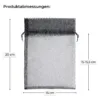 Ein Set, der 10 Stück Organzasäckchen in Farbe schwarz enthält, lässt sich unterschiedlich anwenden. Die Größe von 15 cm x 20 cm ist bestens zum Aufbewahren von kleinen Gegenständen geeignet, wie etwa Schreibwaren, Werbegeschenke, kleine Figürchen und viele andere originelle Artikel - Vielseitigkeit von Organza passt praktisch zu jedem Artikel.