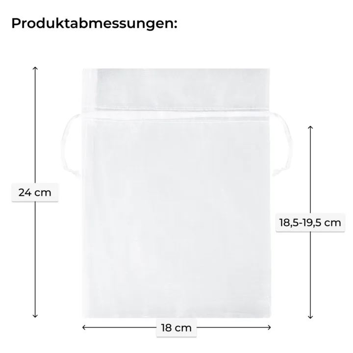 Das Set enthält 10 Stück Organzasäckchen, jeweils 18 x 24 cm groß, in weißer Farbe. Weiße Beutel sind vielseitige Produkte, die verwendet werden können, um verschiedene Gegenstände zu präsentieren. Sie eignen sich hervorragend als transparente Verpackung für Schmuck, handgemachte Seifen, Schreibwaren, Souvenirfiguren, Werbegeschenke oder Proben von Kosmetika und Parfüms. Aufgrund ihrer zarten Farbe werden weiße Organzabeutel auch häufig für die Vorbereitung kleiner Geschenke für Hochzeits- oder Kommunionsgäste verwendet.