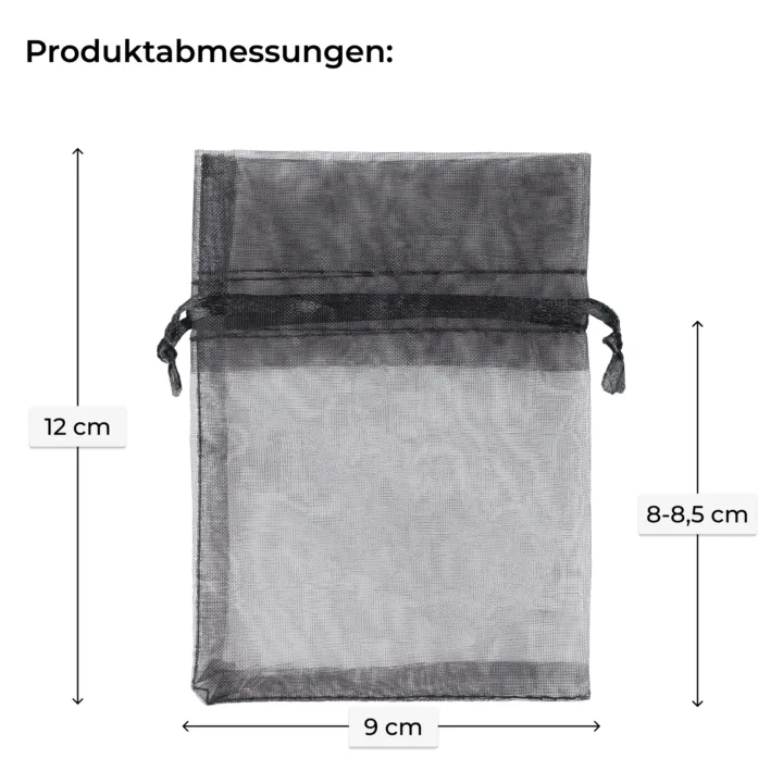Ein Set, in dem kleine Organzasäckchen ca. 9 cm x 12 cm groß in Farbe schwarz enthalten sind. Dieser praktische Set besteht aus 25 Stück, daher ist es nicht nötig, kurzfristig neue Beutel nachzubestellen.