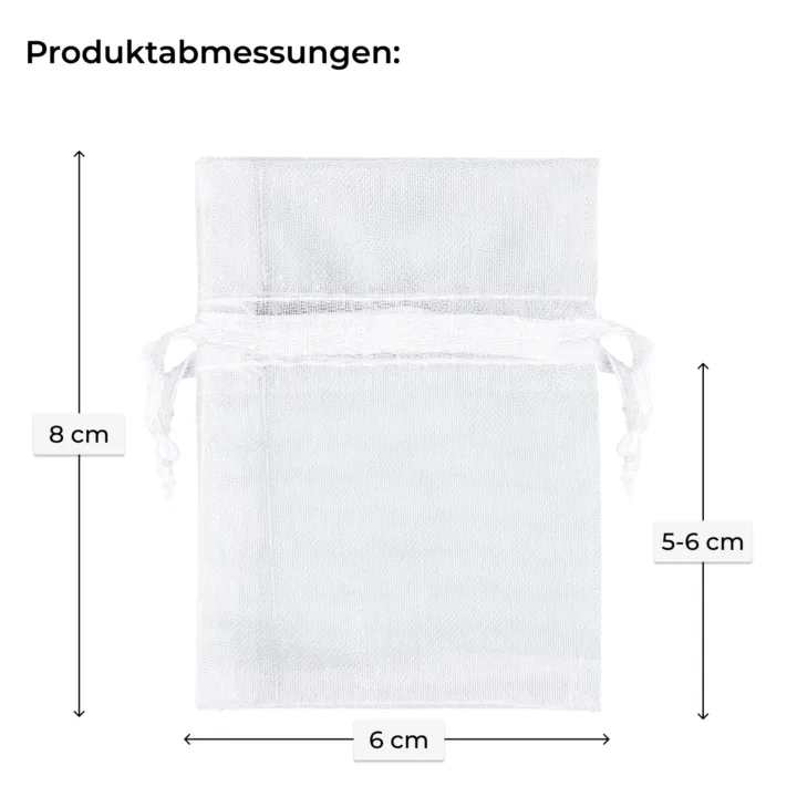 Ein Set, in dem kleine Organzasäckchen ca. 6 cm x 8 cm groß in Farbe weiß enthalten sind. Dieser praktische Set besteht aus 25 Stück, daher ist es nicht nötig, kurzfristig neue Beutel nachzubestellen.