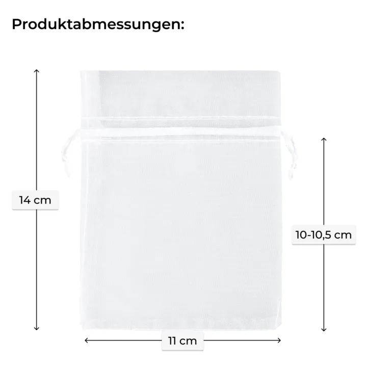 Ein Set, in dem kleine Organzasäckchen ca. 11 cm x 14 cm groß in Farbe weiß enthalten sind. Dieser praktische Set besteht aus 25 Stück, daher ist es nicht nötig, kurzfristig neue Beutel nachzubestellen.