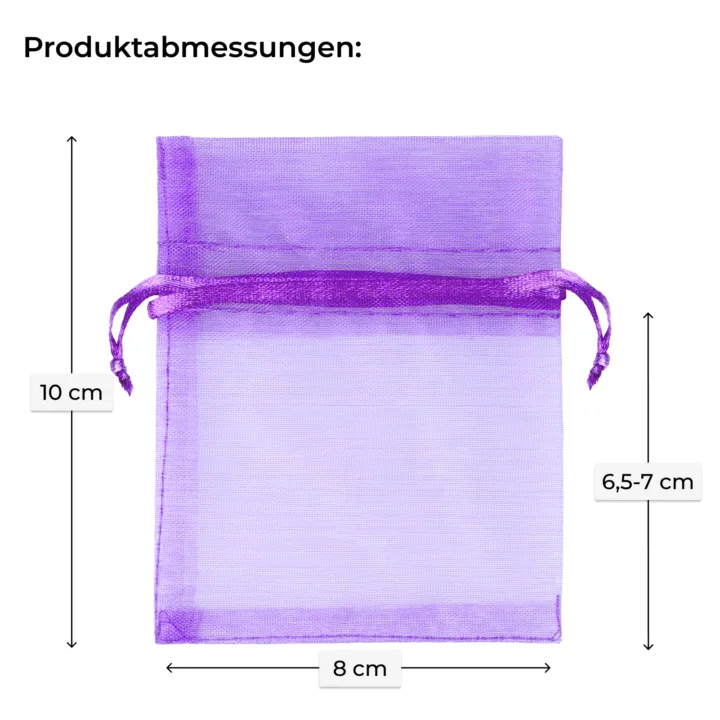 Organzasäckchen in der Größe 8 x 10 cm in Violett sind ein Produkt, das Langlebigkeit und Eleganz vereint. Dank der hochwertigen Materialien sind unsere Säckchen robust und widerstandsfähig gegen Beschädigungen, was eine lange Nutzungsdauer garantiert. Sie eignen sich ideal zum Verpacken von Geschenken, zur Aufbewahrung von Schmuck oder Kosmetik und auch für Hochzeitsdekorationen und andere Feierlichkeiten.