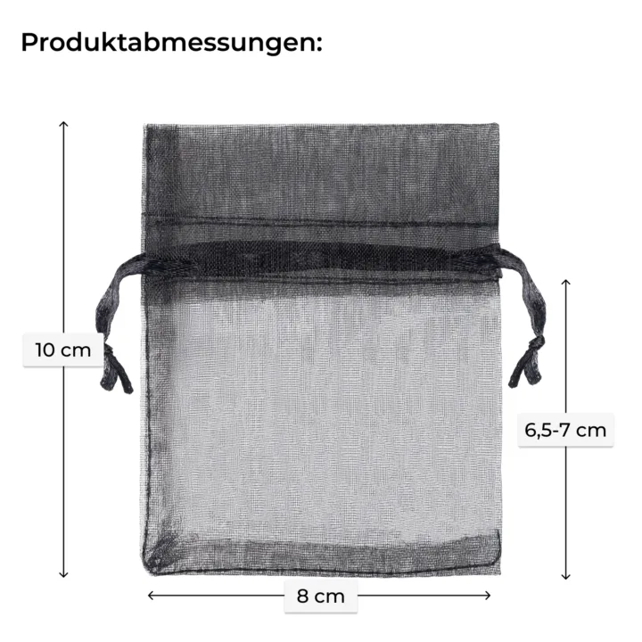 Ein Set, in dem praktische Beutel aus Organza enthalten sind. Der angebotene Set besteht aus 25 Stück in Farbe schwarz, die jeweils ca. 8 cm x 10 cm groß sind.