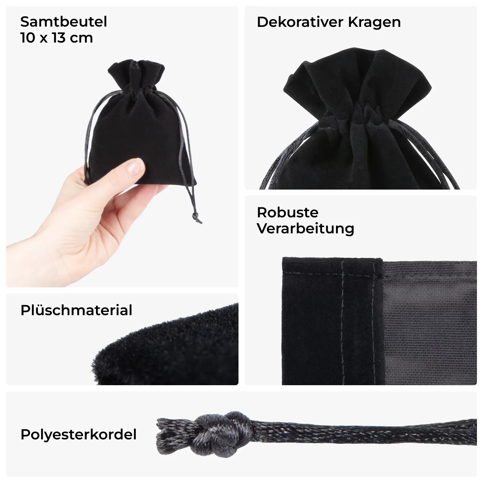 Wir stellen Ihnen ein außergewöhnliches Set von Samtbeuteln vor, welches 10 Stück zählt. Es ist in schwarz und in der Größe 10 x 13 cm erhältlich. Dieses außergewöhnliche Set ist universell und durch die größere Menge wird es über längere Zeit gute Dienste erweisen.