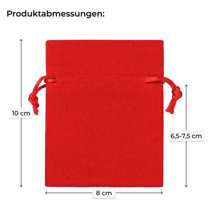 Wir bieten Ihnen ein Set von 10 Stück Beuteln aus Samt in den Maßen 8 x 10 cm. Dieses praktische Paket ist in der Farbe Rot erhältlich und wird Ihnen eine lange Zeit dienen.