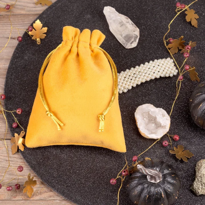 Diese Samtsäckchen mit Kordelzug begeistern durch ihre einzigartige Farbe! Für einige ähneln sie süßem, goldenem Honig, für andere wie in Sonnenlicht getauchtes Herbstlaub.